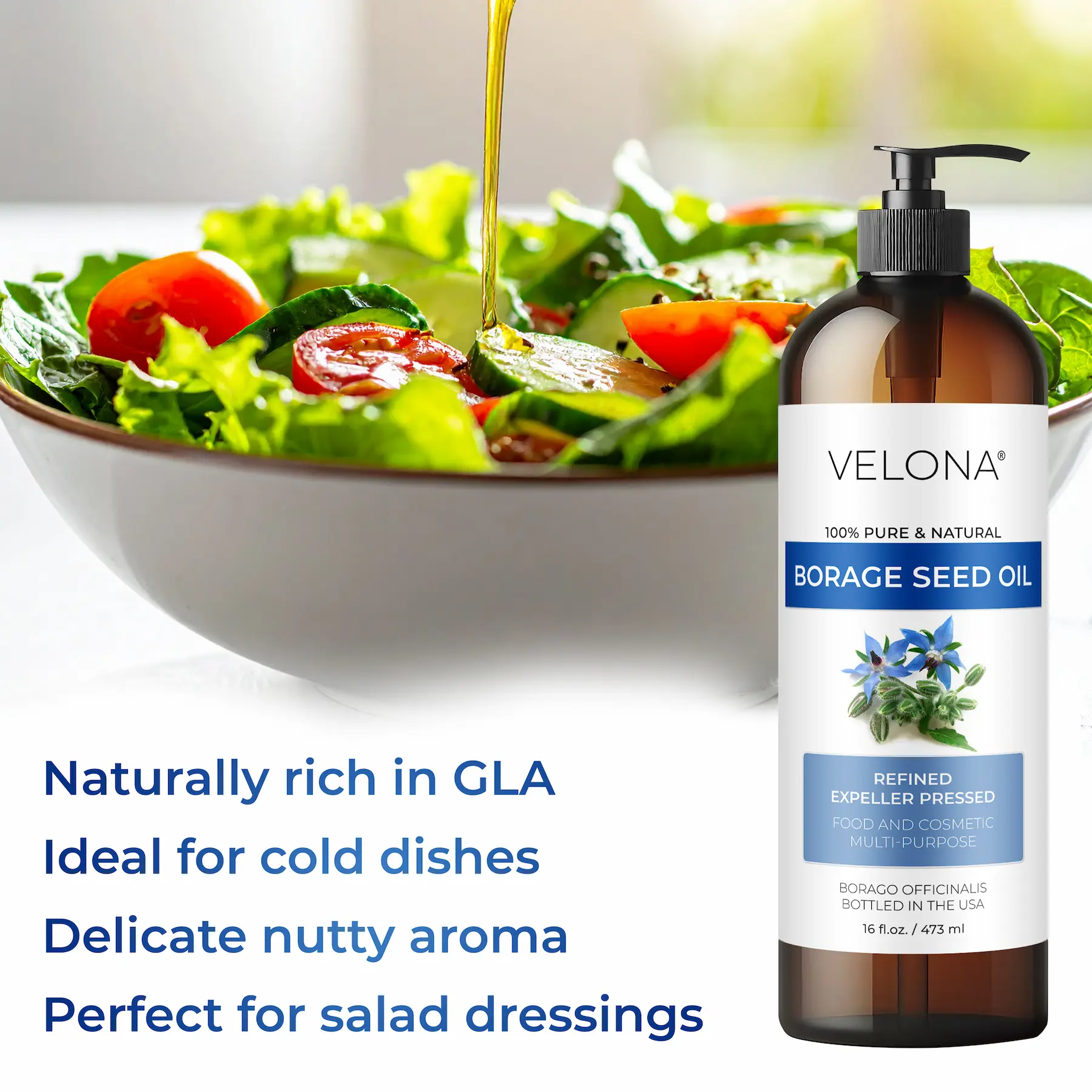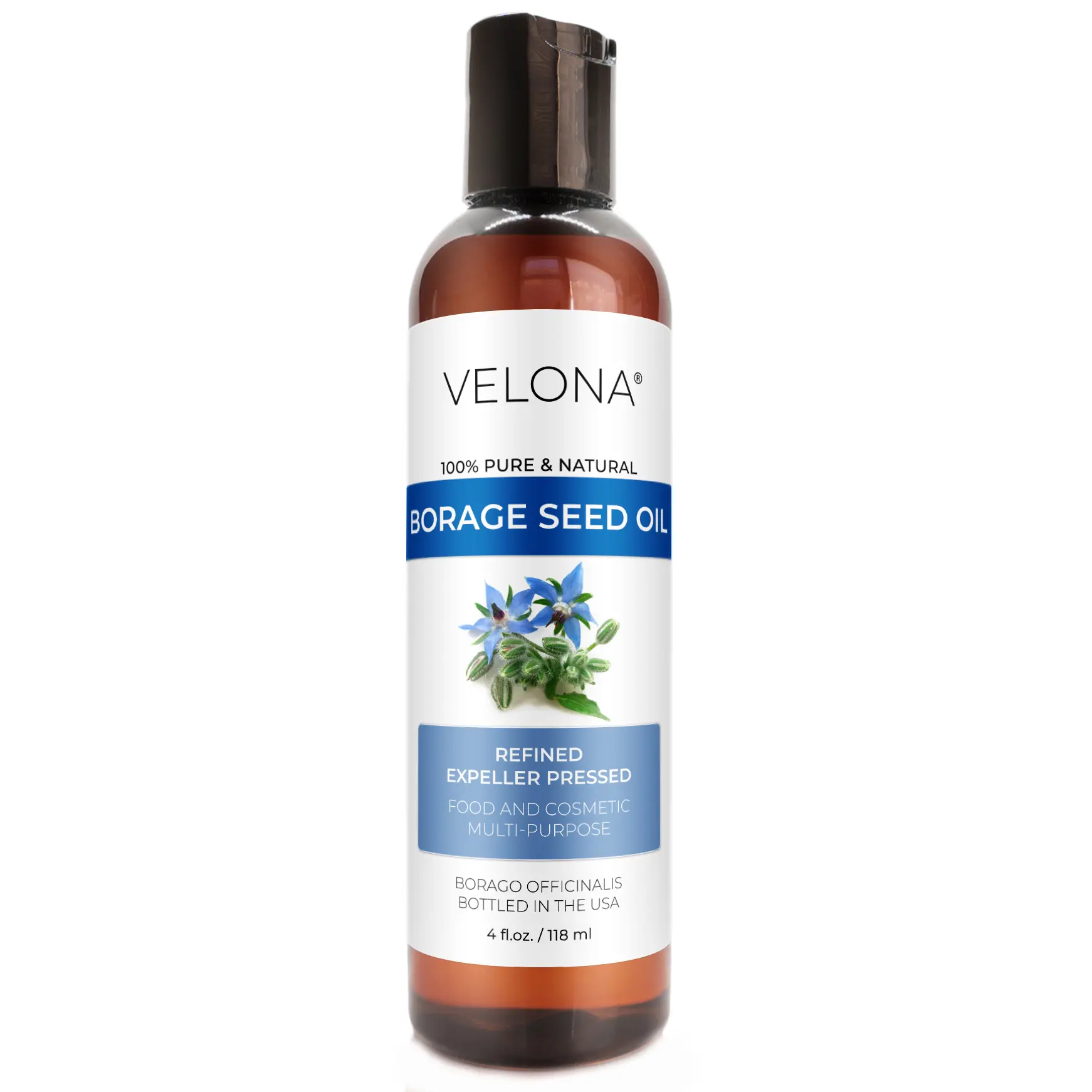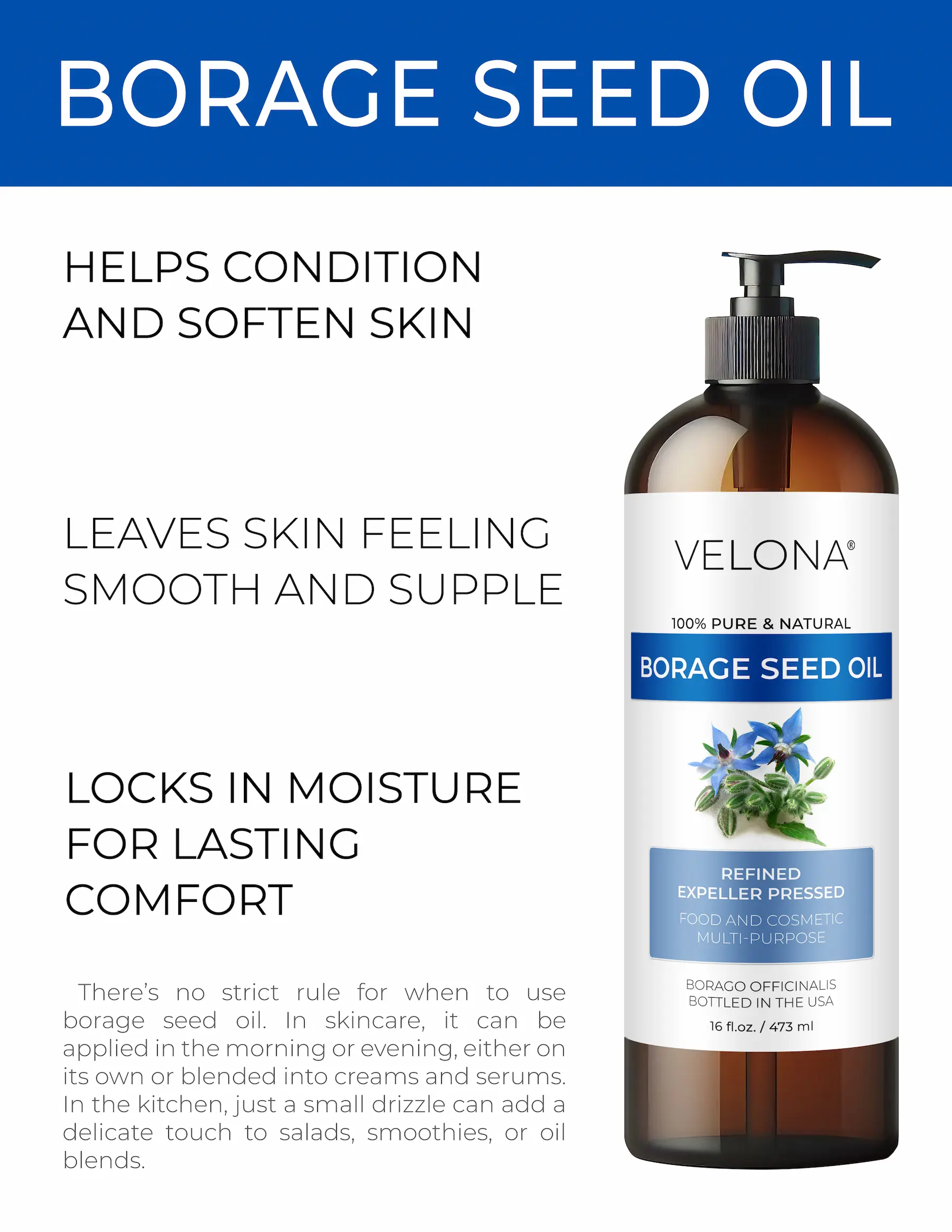 100% Pure and Natural Borage Seed Oil. Refined, expeller pressed, free from additives, fragrance, and synthetic compounds.
