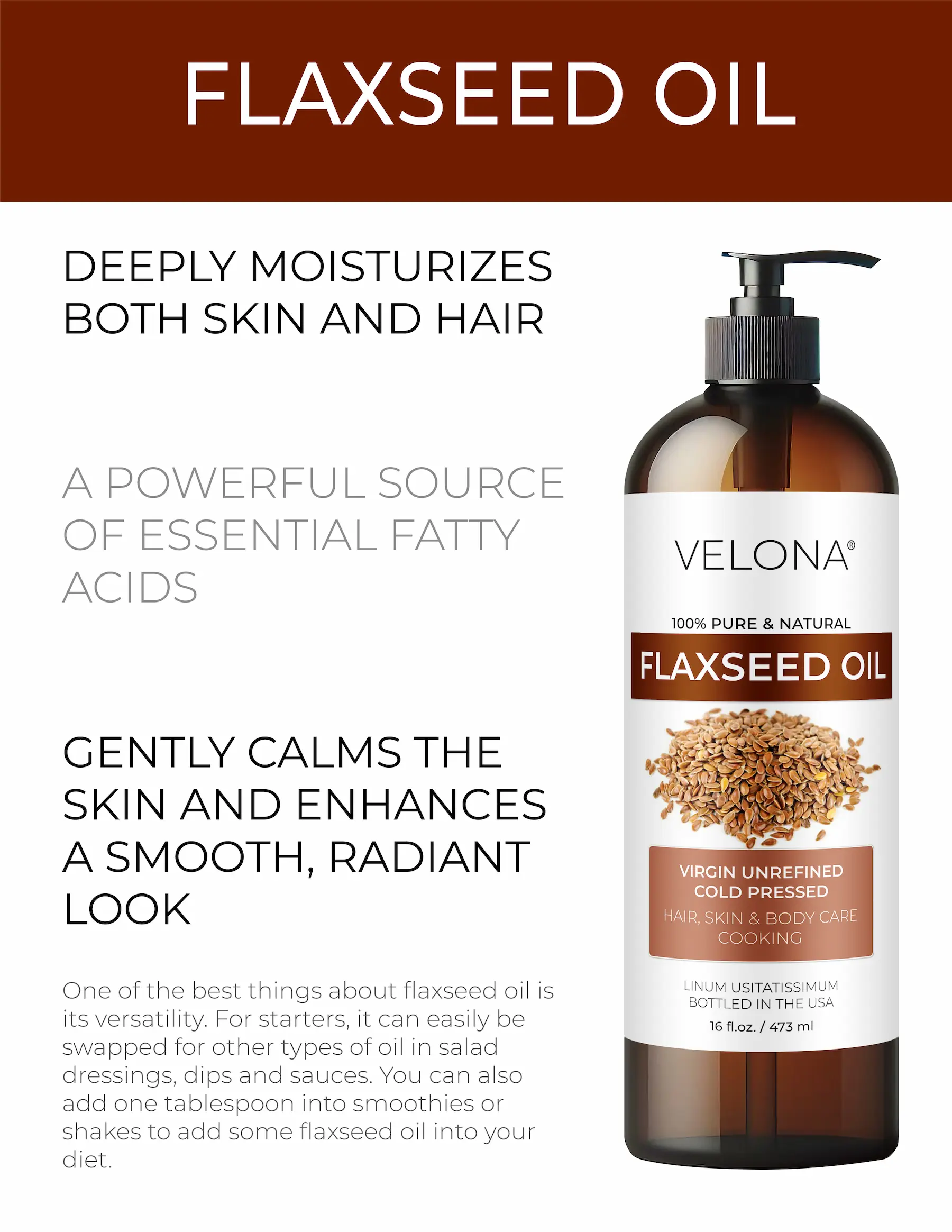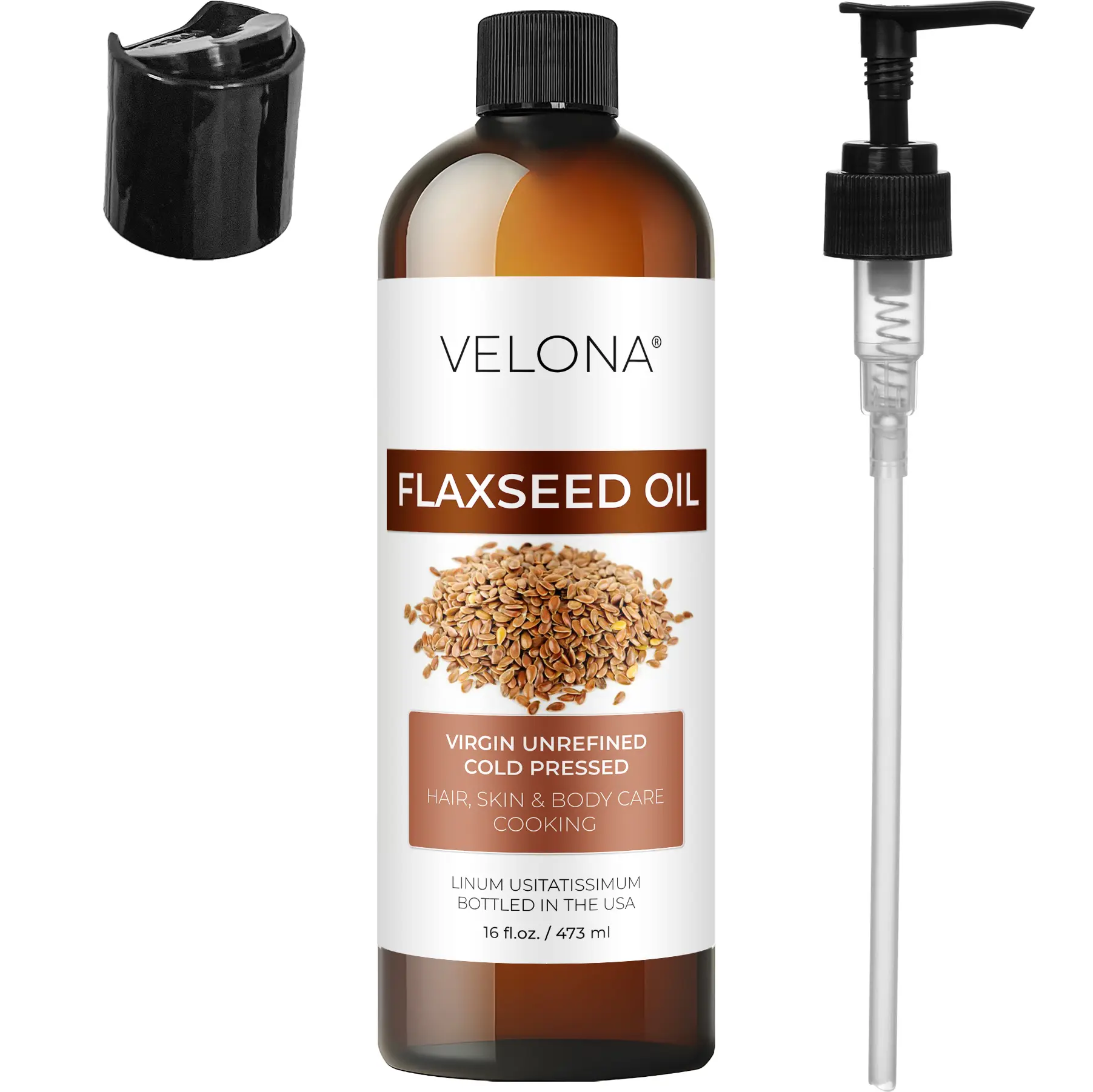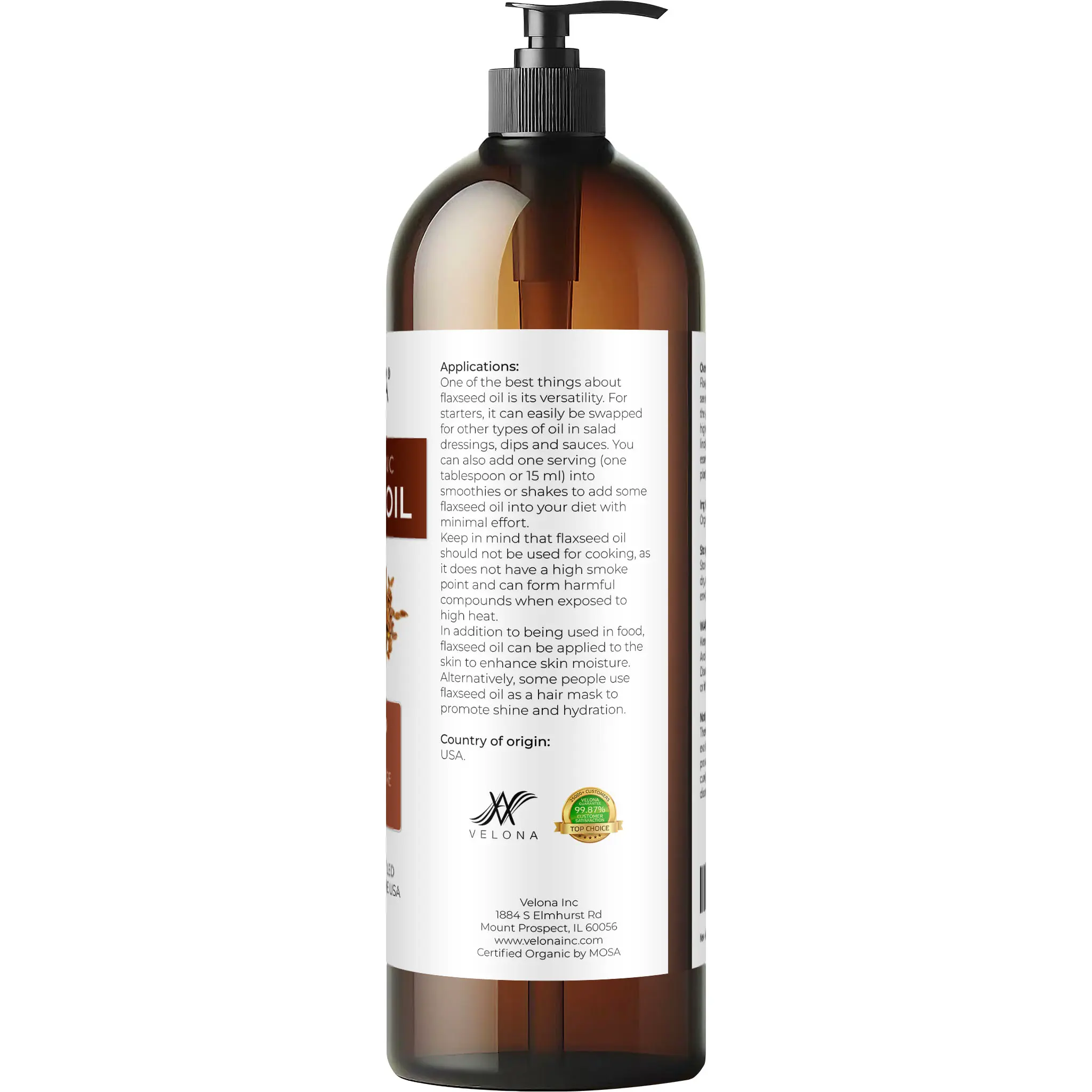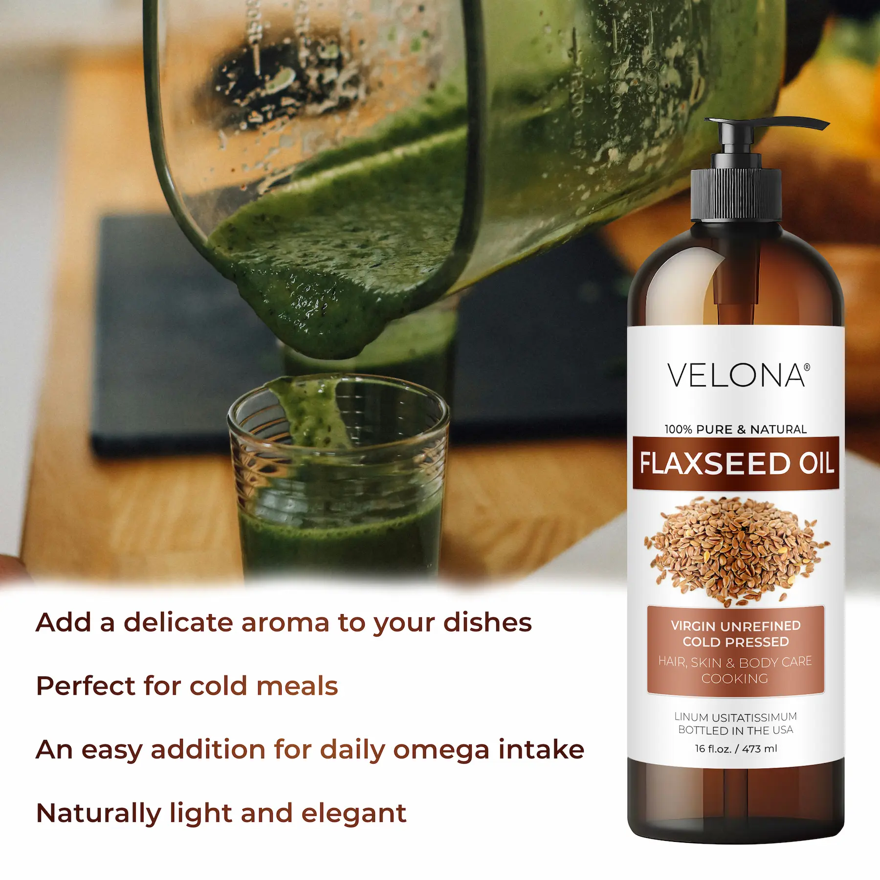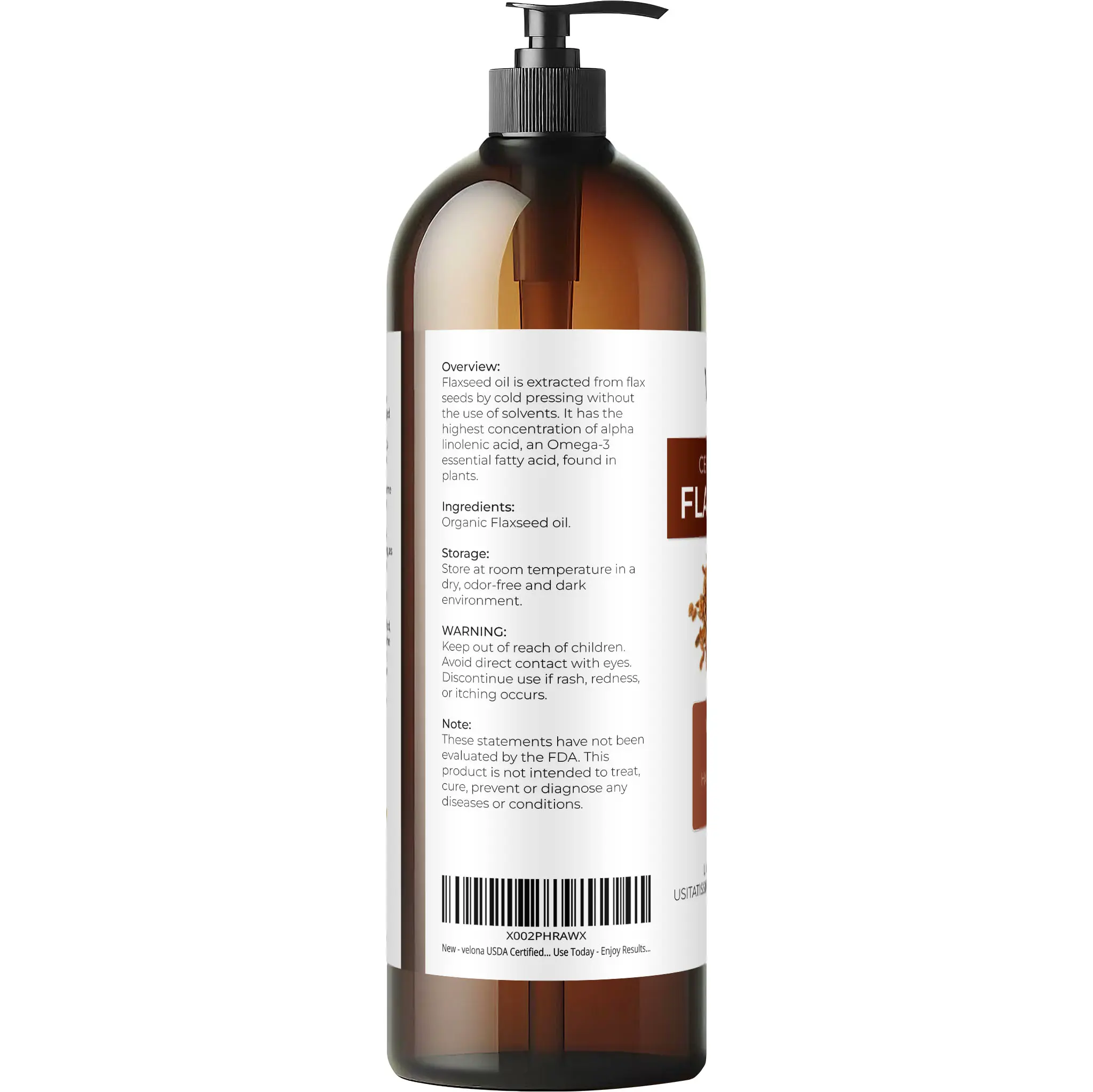 USDA Organic and 100% pure Flaxseed oil. Free from additives or synthetic compounds. Embrace the natural goodness.