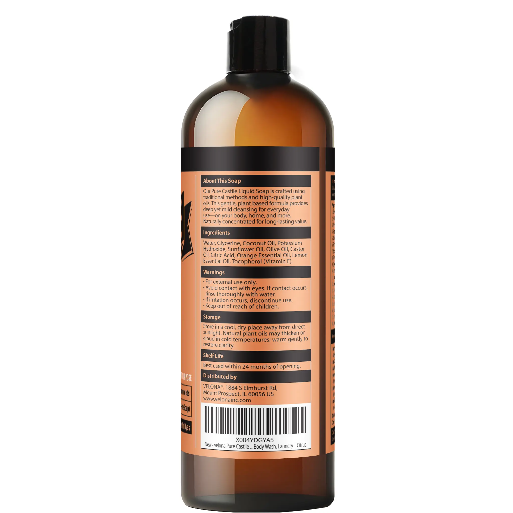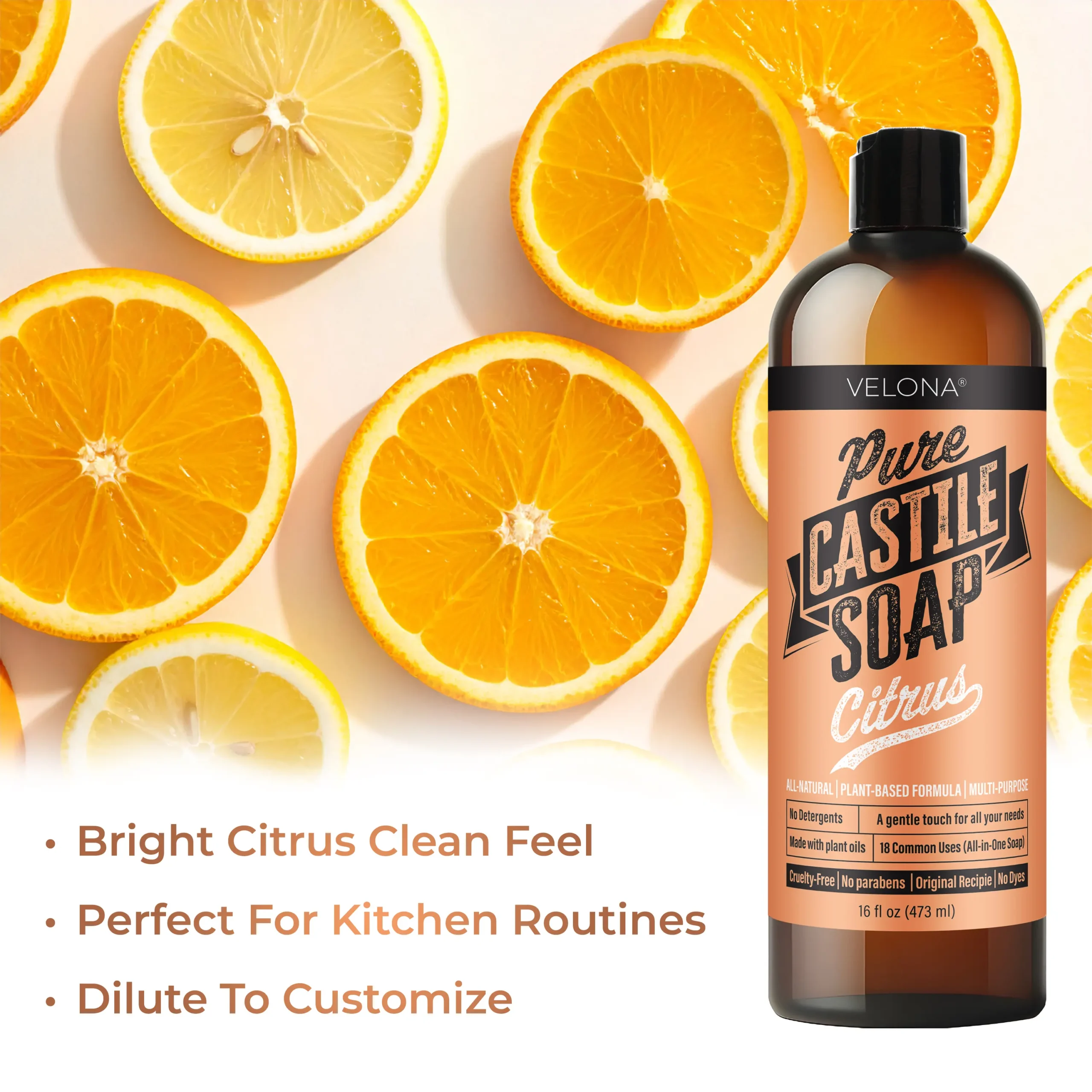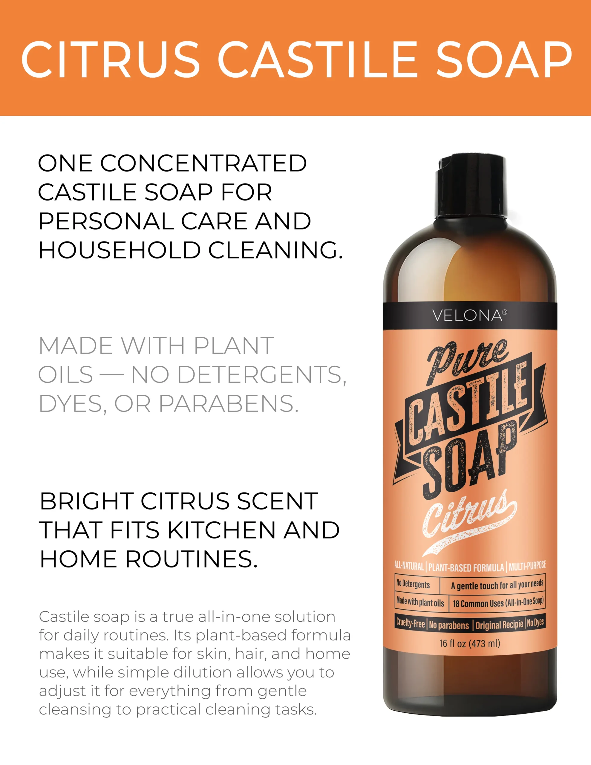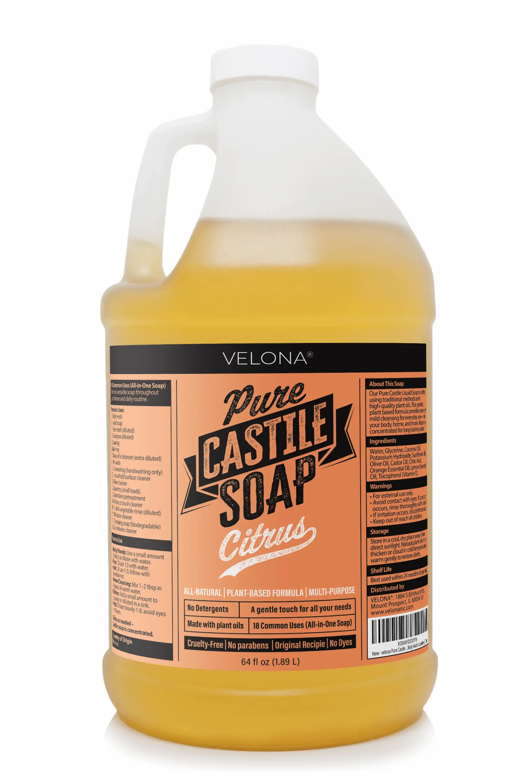 One concentrated soap for body care, handwashing, hair, and household cleaning when diluted as needed.