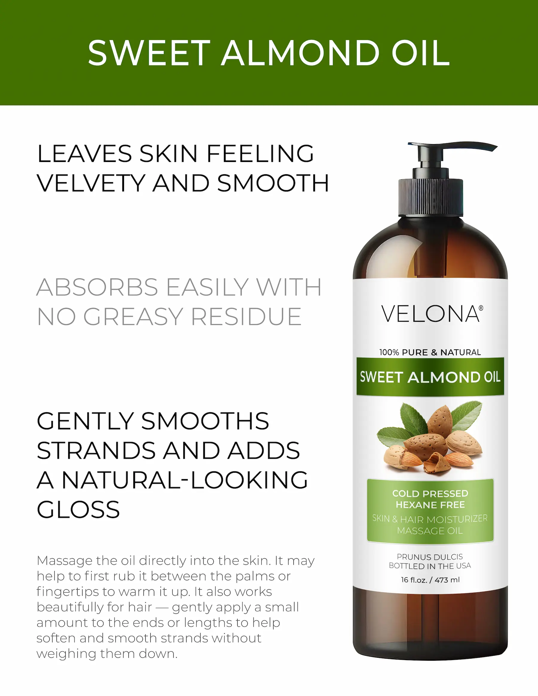 100% Pure and Natural Sweet Almond Oil. Free from additives or synthetic compounds. Embrace the natural goodness