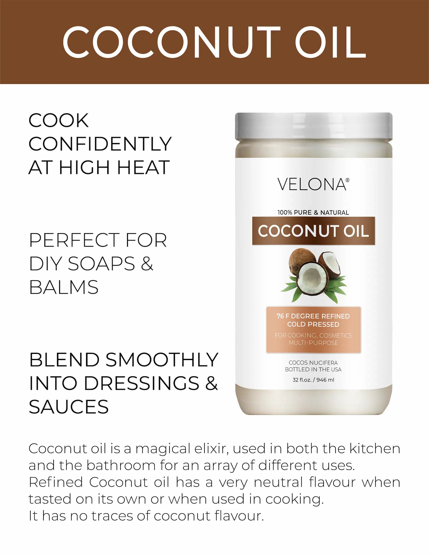 100% Pure and Natural Coconut Oil. Free from additives or synthetic compounds. Experience its natural richness.