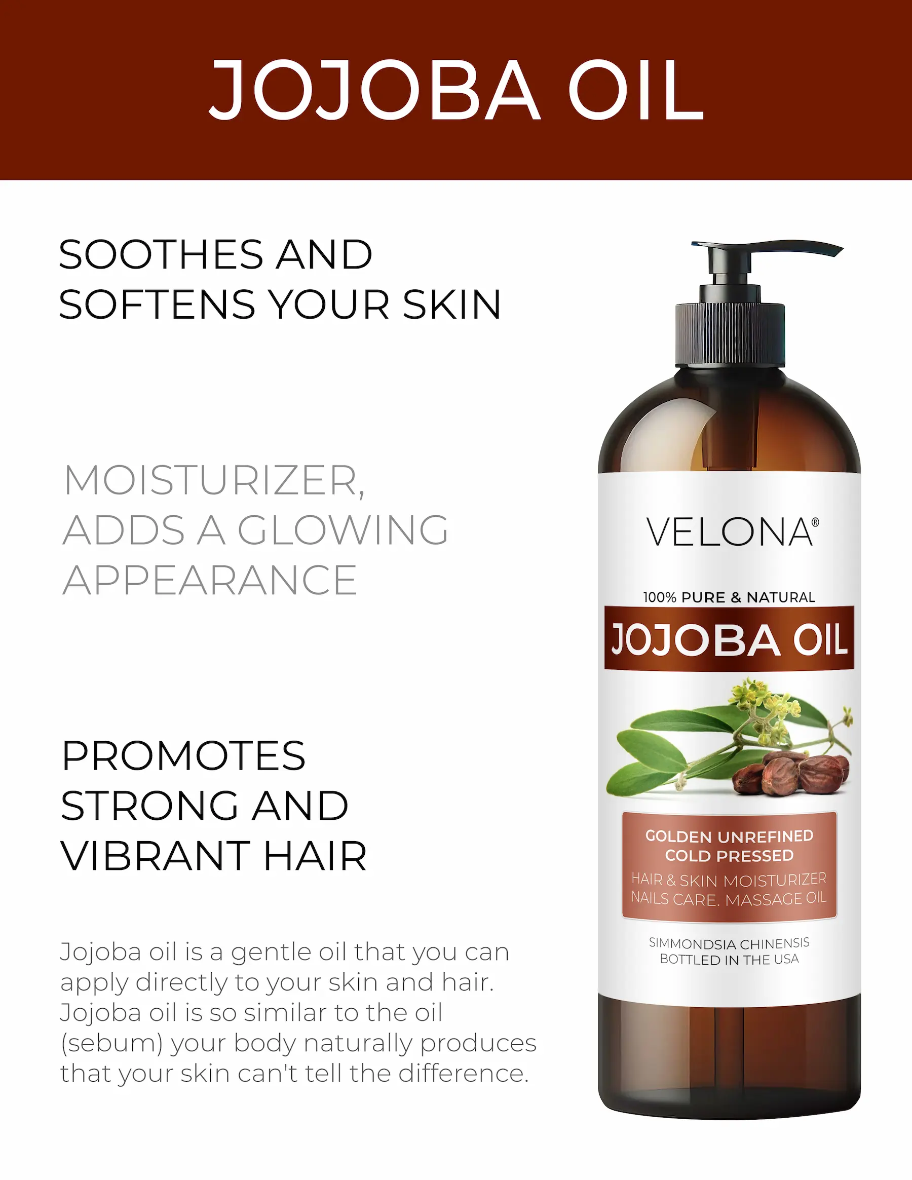 • 100% Pure & Natural Jojoba oil: 100% Pure and Natural. Cold pressed. Not Diluted, Non-GMO, No Additives, No Fragrance, Chemical Free, Alcohol Free, Hexane Free.